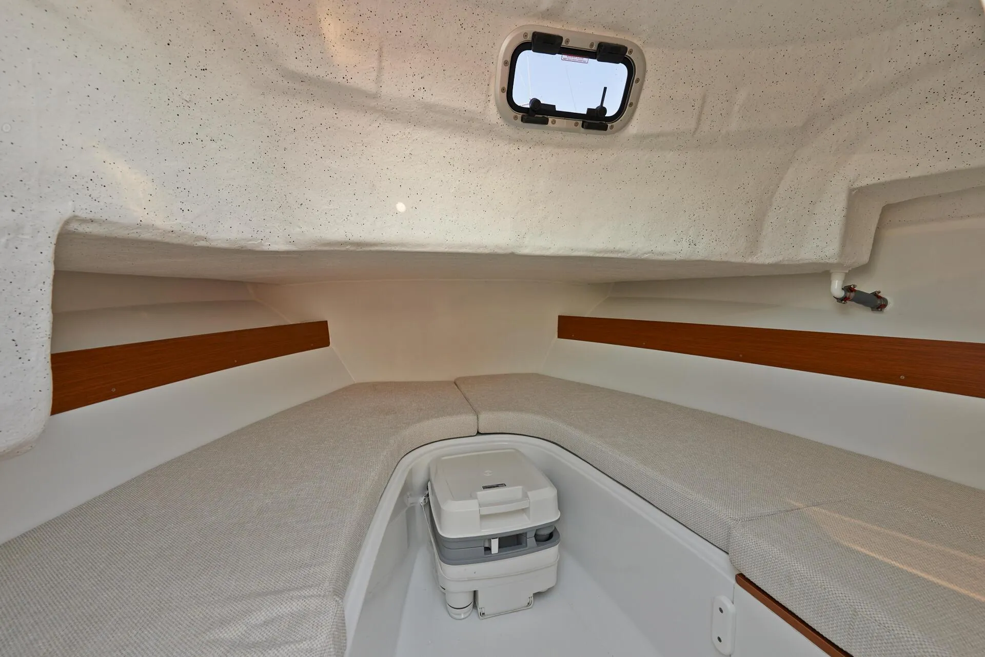 The Walk Around version of the Cap Camarat 5.5 features a level surface on the forward deck for comfortable sunbathing. The cabin includes two berths, storage, and an optional chemical toi-let. At anchor, the cockpit can easily be transformed to create an inviting space, even with the engine raised, with its removable table, pivoting bolster seats, and sliding bench seating. The Cap Camarat 5.5 WA also offers the advantage of being easily transported for explor-ing new bodies of water.