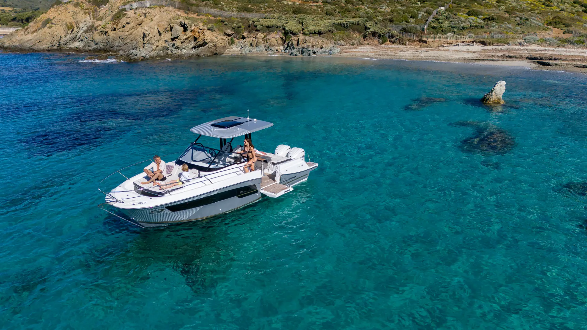 Spirited while cruising, the Cap Camarat 9.0 WA Series 2 is dedicated to relaxation and a laid-back lifestyle when at anchor. The foldaway backrest of the aft bench seat transforms the aft cockpit into a vast sundeck in just seconds. The side terrace extends the cockpit and provides secure, easy access to the sea, for swimming in complete safety.