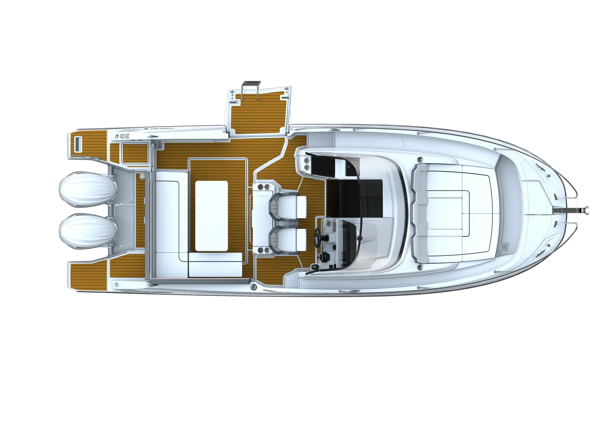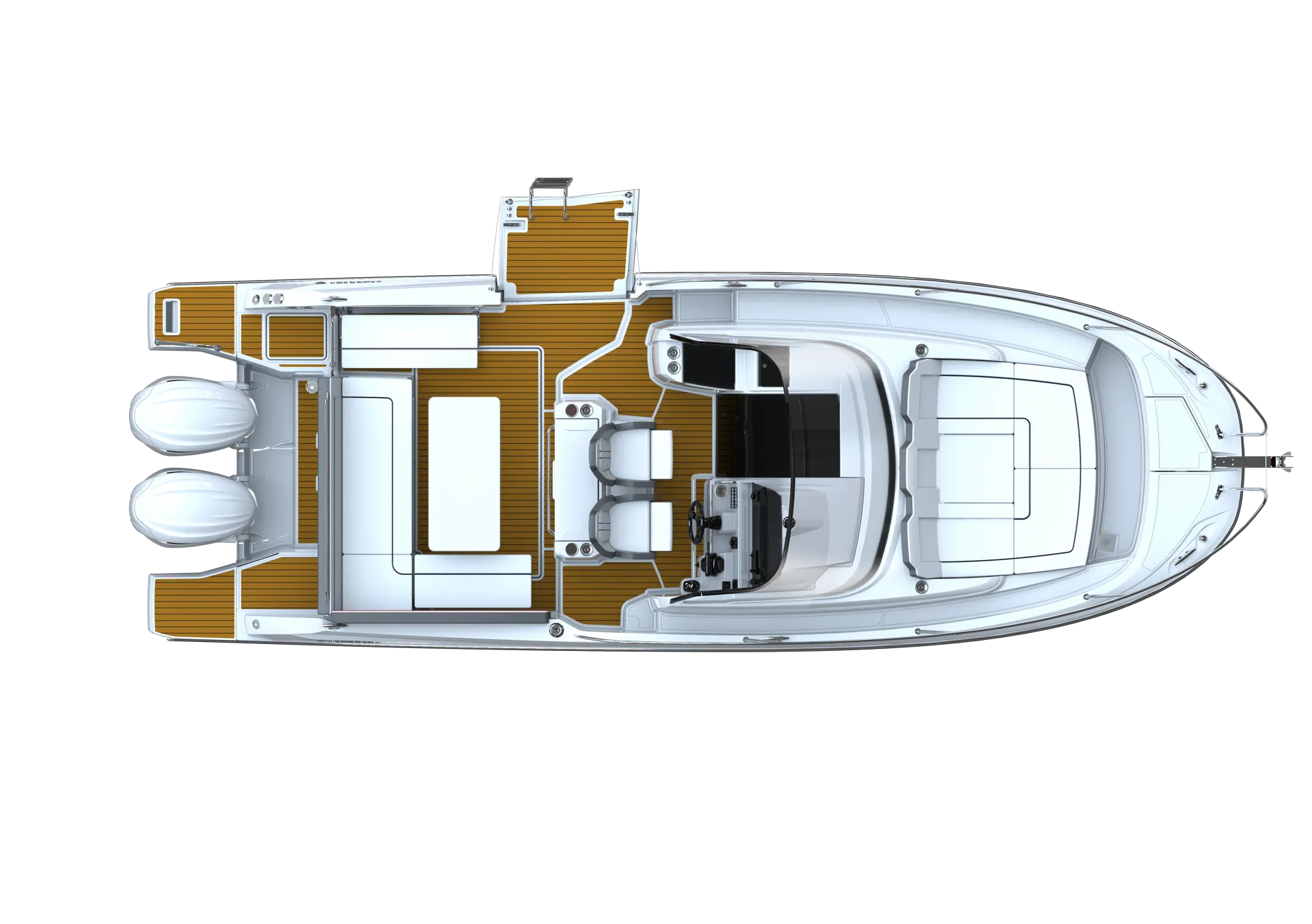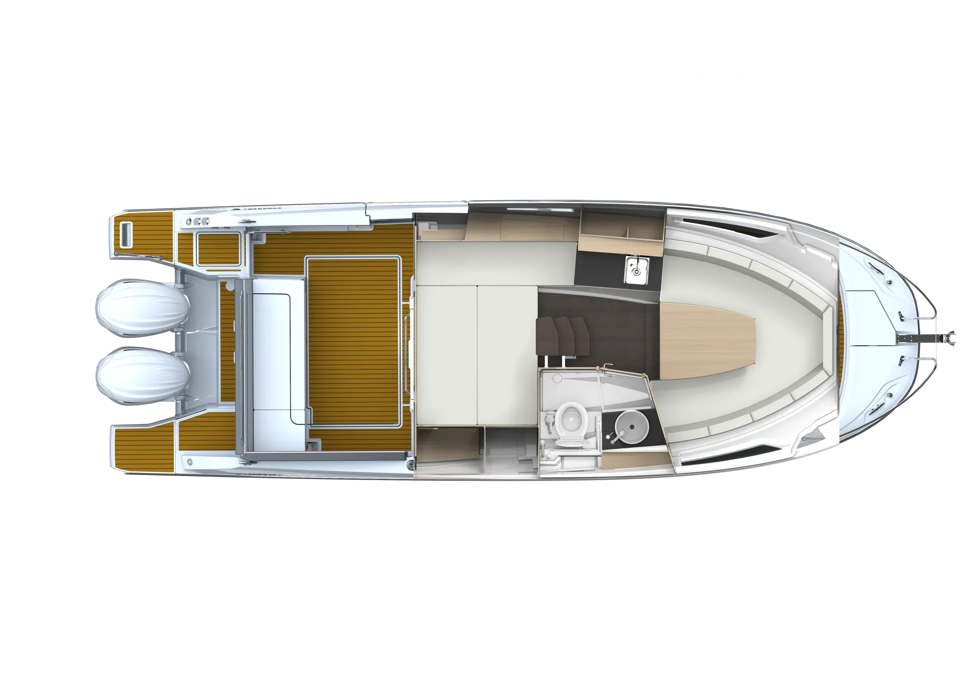 The forward deck features a true additional cockpit, for relaxing and enjoying a drink while seated in a sun lounger, or a module can be added to form a sundeck. At the end of the day, an exterior galley, consisting of a grill and refrigerator incorporated in an optional leaning post, enables you to prepare a nice meal, facing the sunset, before spending a night at sea in two superb separate cabins, each cosy and well-lit, with double berths.