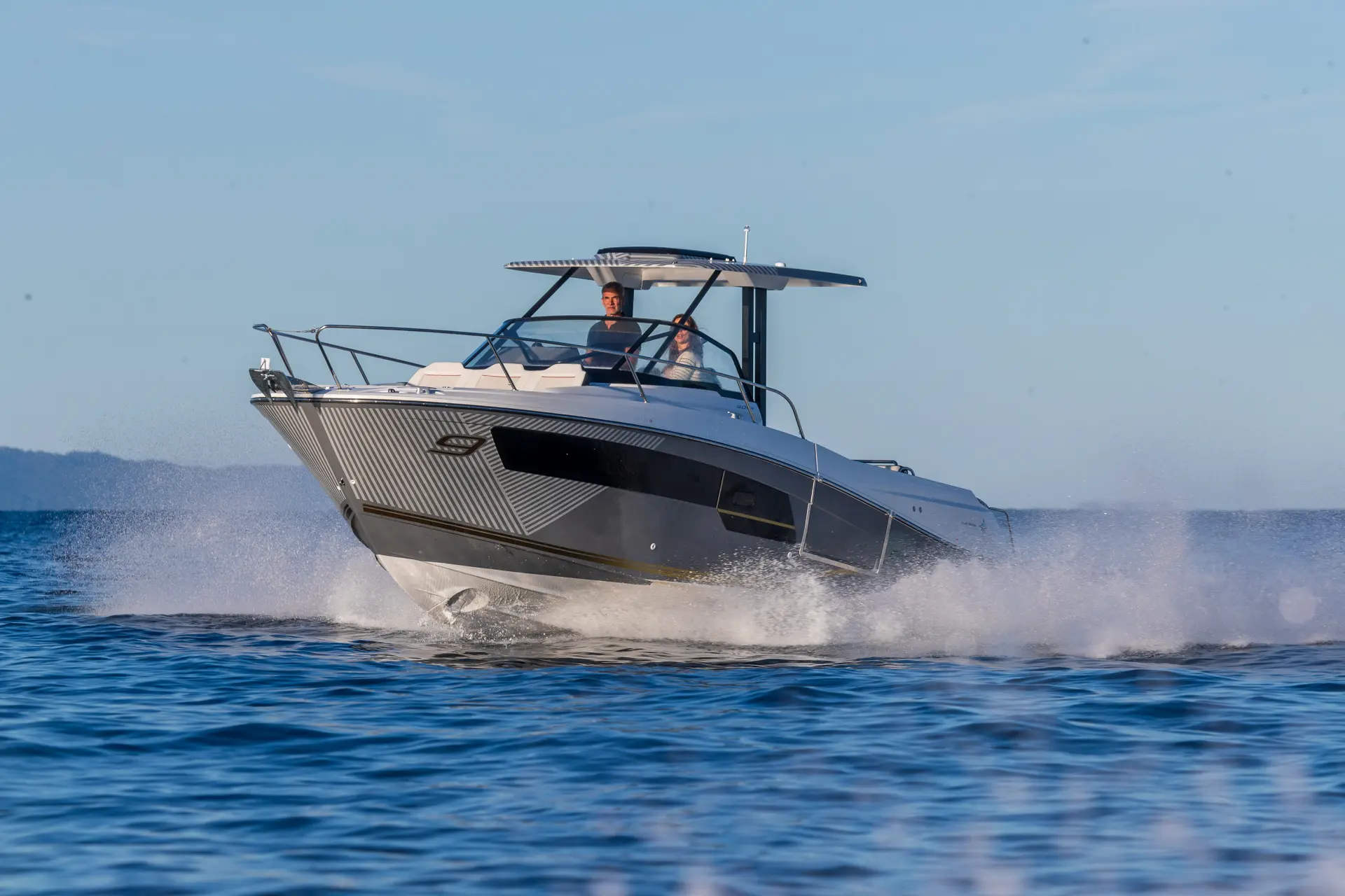 Boasting a V-shaped hull by Michael Peters and twin engines, for up to 2 x 250 HP, the Cap Camarat 9.0 WA Series 2 will delight thrill-seekers and fans of express crossings, the wind in their hair, with top speeds of over 40 knots. With elongated lines, a T-top, a protective glass windscreen, and large windows in the hull… this boat, inspired by the Cap Camarat 10.5 WA and 12.5 WA, boasts an elegant, distinguished, and contemporary style, yet one that is also synonymous with safety and fun for the whole family.