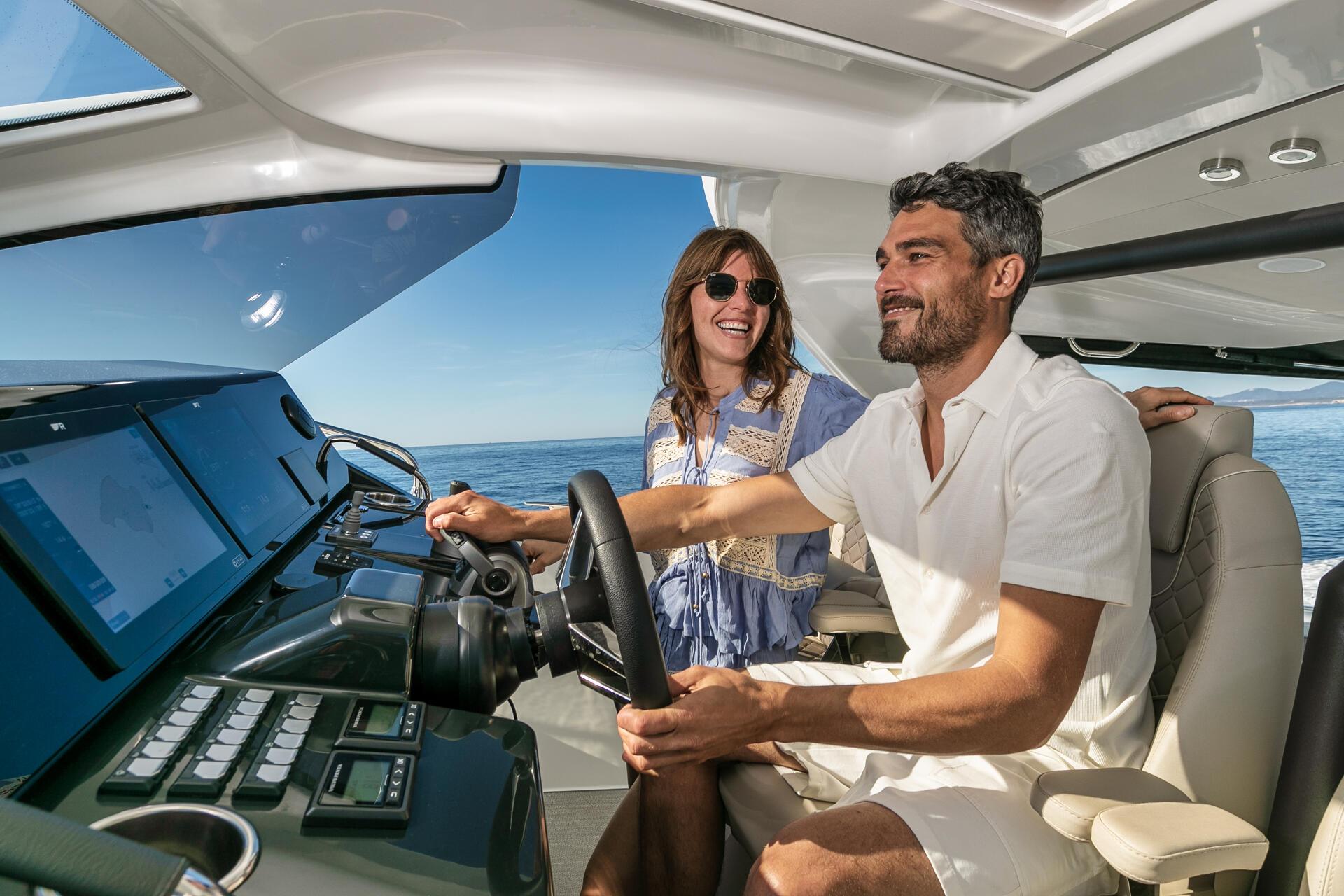 With pure lines, an assertive personality, and a sporty style… the DB/37 does not go unnoticed. While the allure of this day boat makes a bold first impression, her concept is truly extraordinary. Her incredibly spacious deck plan offers remarkable fluidity of movement on board. Under way, she combines speed, comfort, and safety. Guests can be comfortably seated on individual seats next to the pilot, facing a large integrated windscreen and sheltered by a hard sport top, or in the sun, in the forward cockpit, accessible via two wide, secure sidedecks. At anchor, the aft cockpit transforms into an immense living space, opening onto the water and ideal for swimming, with the deployment of electrically opening side terraces.