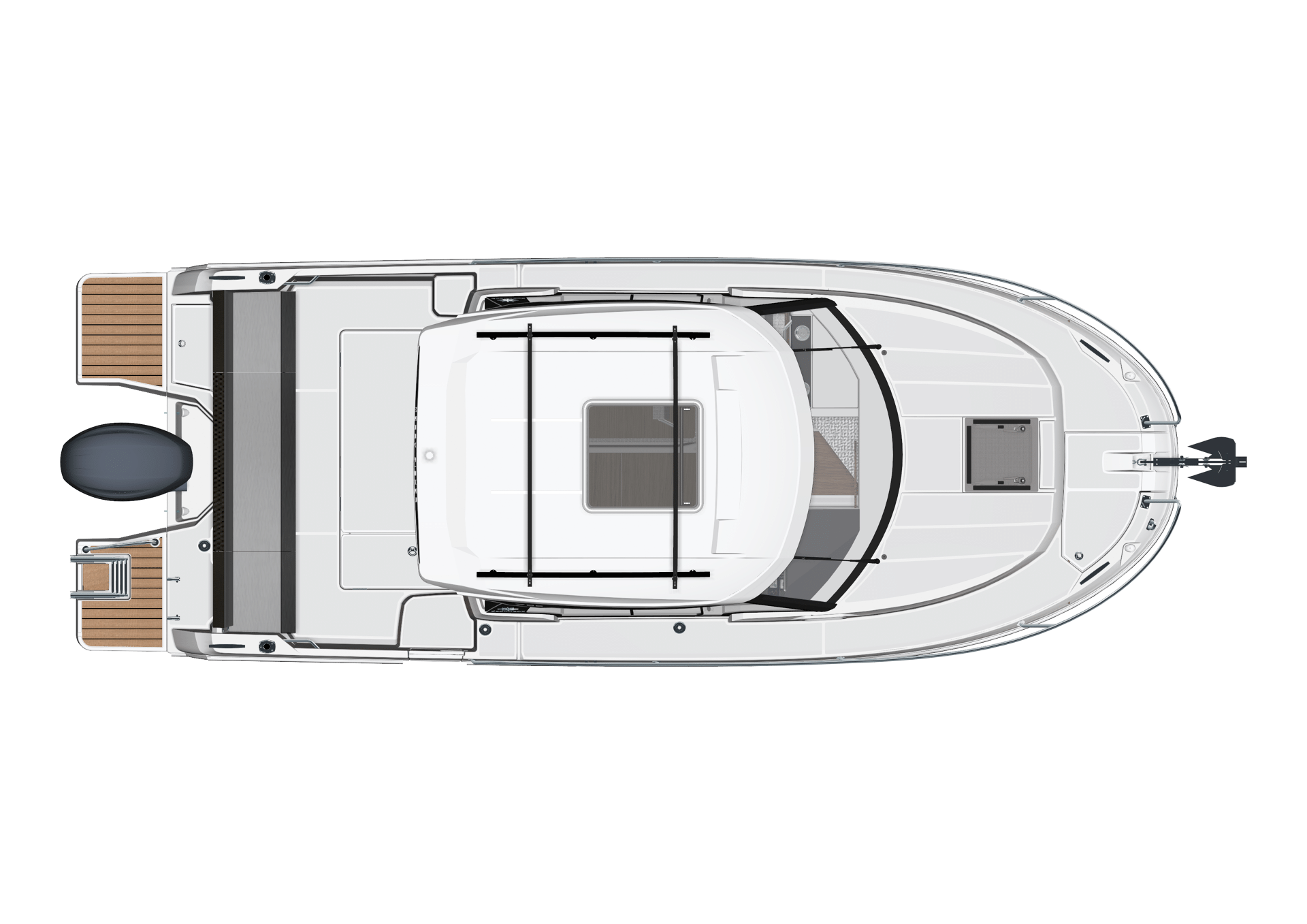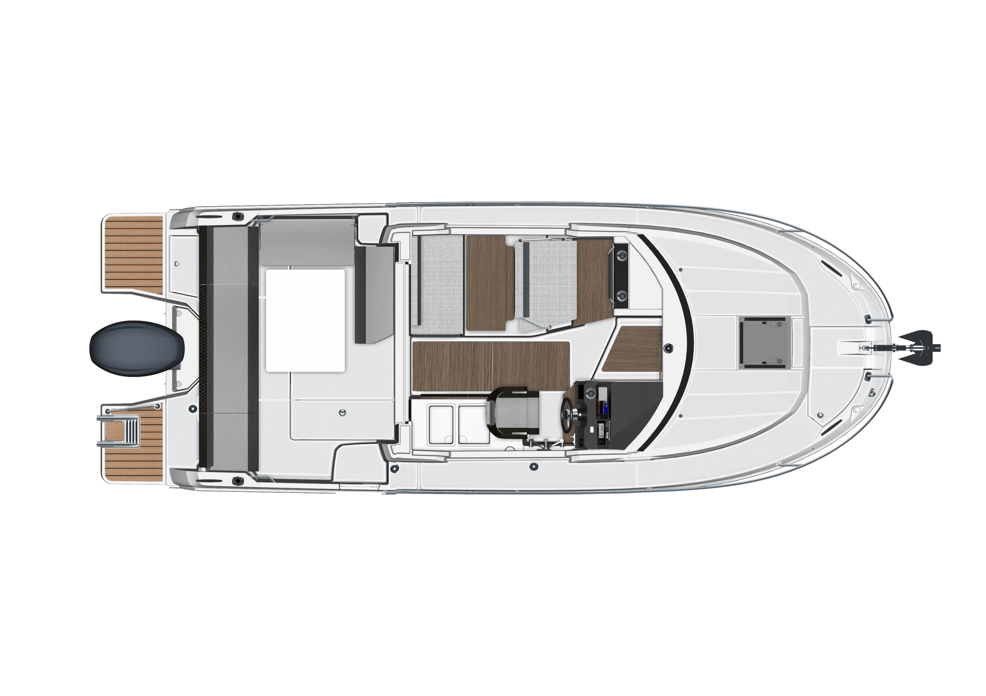 Enjoyable to drive, easy to live with, elegant and contemporary, the Merry Fisher 795 suits a variety of profiles and, in addition, offers numerous possibilities for personali-sation in function with your preferences. Do you appreciate greater ease of use? The bowthruster and electric winch make child’s play of handling at port. Do you enjoy sportier cruising? Engines of up to 250 HP enable enhanced performance for higher-energy crossings. Are you seeking greater comfort and a welcoming atmosphere? The U-shaped cockpit configuration, galley with a burner and countertop, and air conditioning will make your boat into a cosy and inviting haven in all seasons.