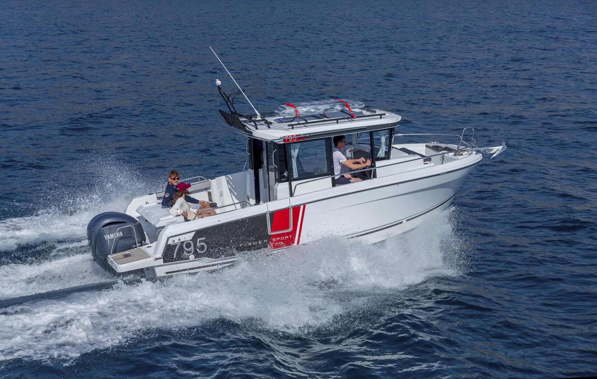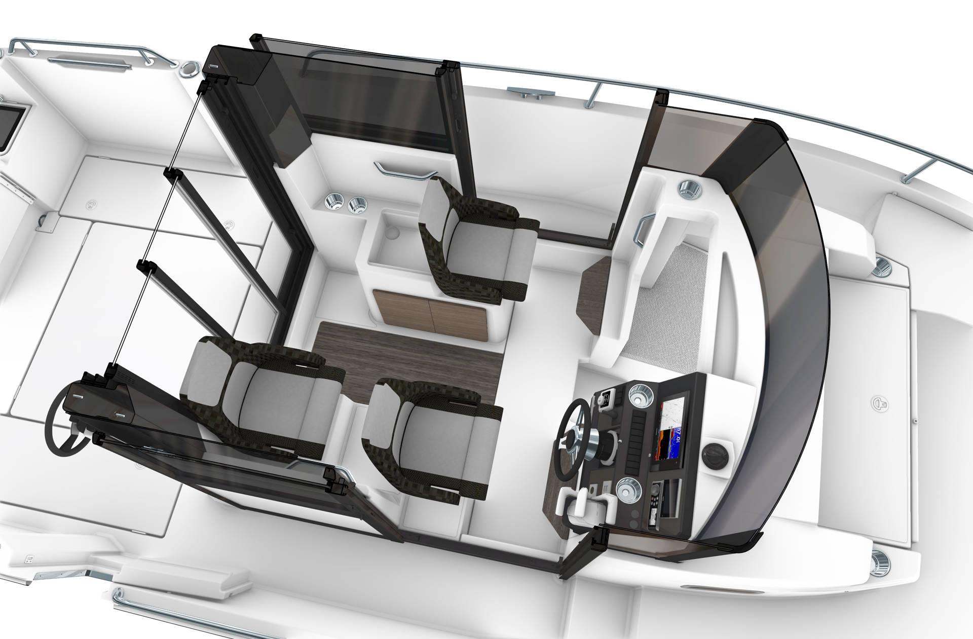 The Merry Fisher 795 Sport is designed to facilitate sporty outings at sea. The vast, modular cockpit enables you to clear the space entirely, with numerous storage lockers and at-tachment systems for fishing or other marine activities requiring the handling of equipment. Even the cockpit roof is designed without supports, in order to facilitate movement on board and avoid obstructions while casting. In just minutes, the cockpit changes into a saloon with removable bench seating and tables. This boat also features a U-shaped saloon in the forward cockpit, with two atmospheres that can be perceived from one side or other of the wheelhouse.
