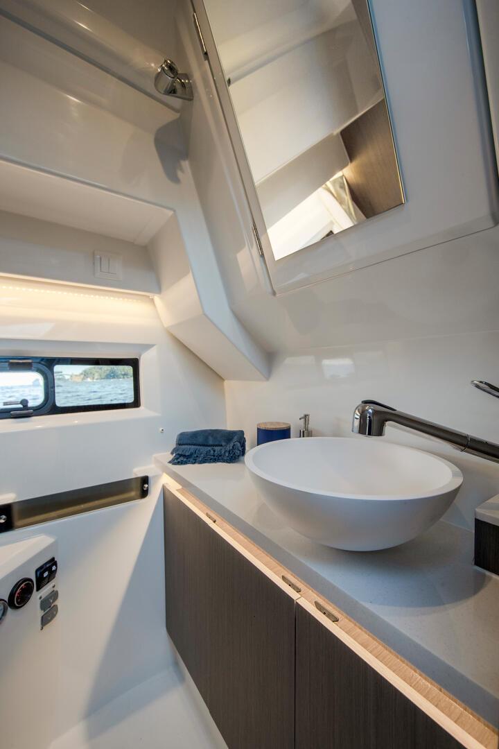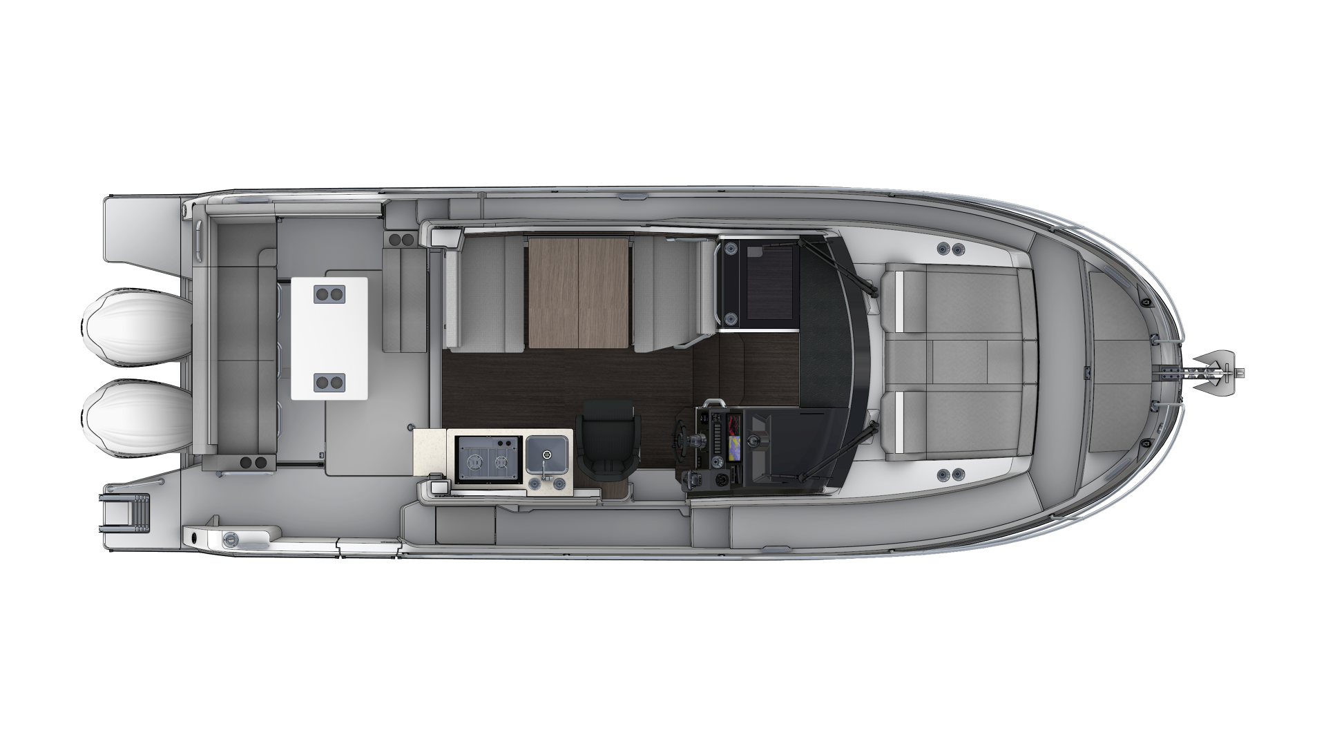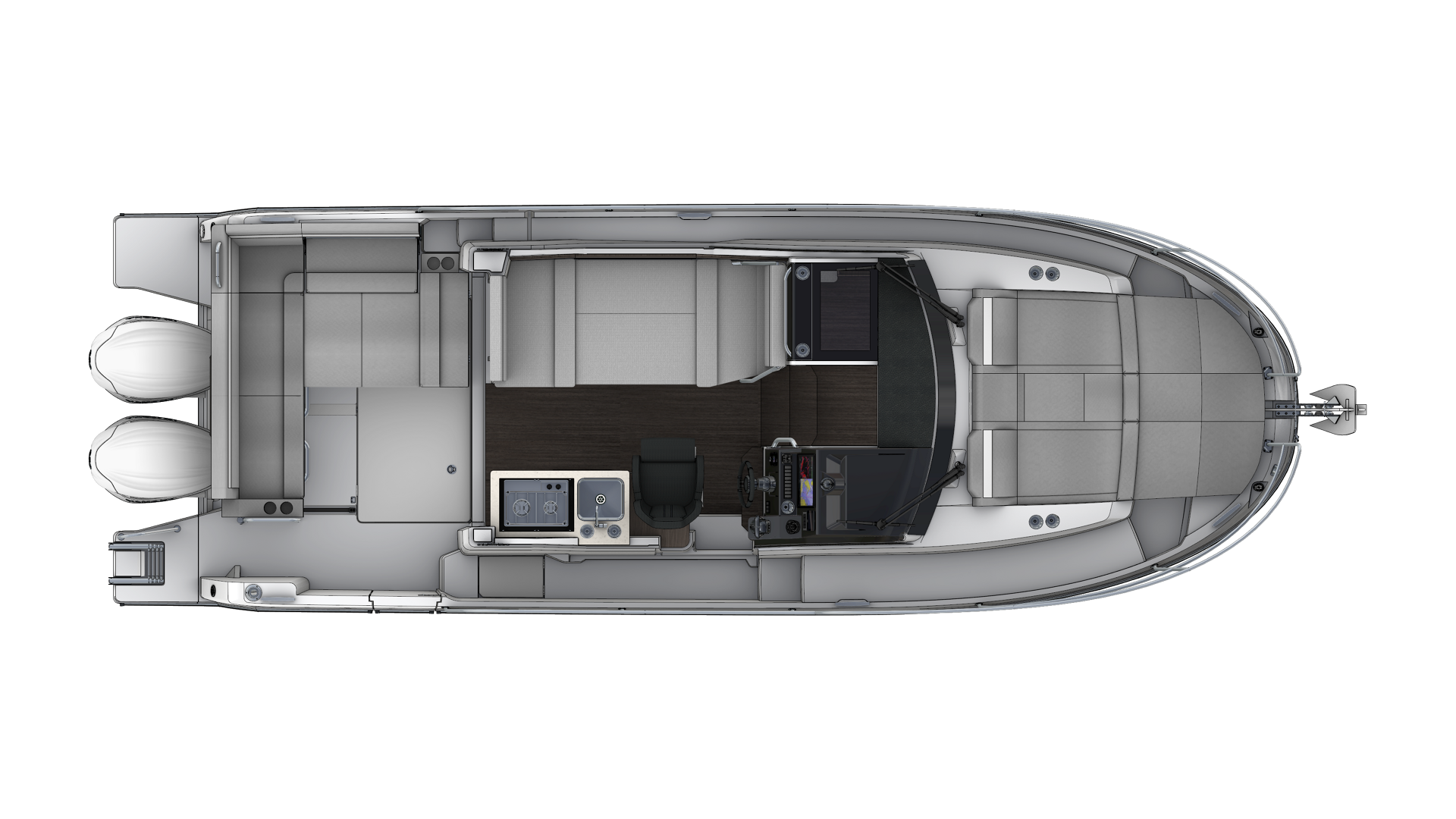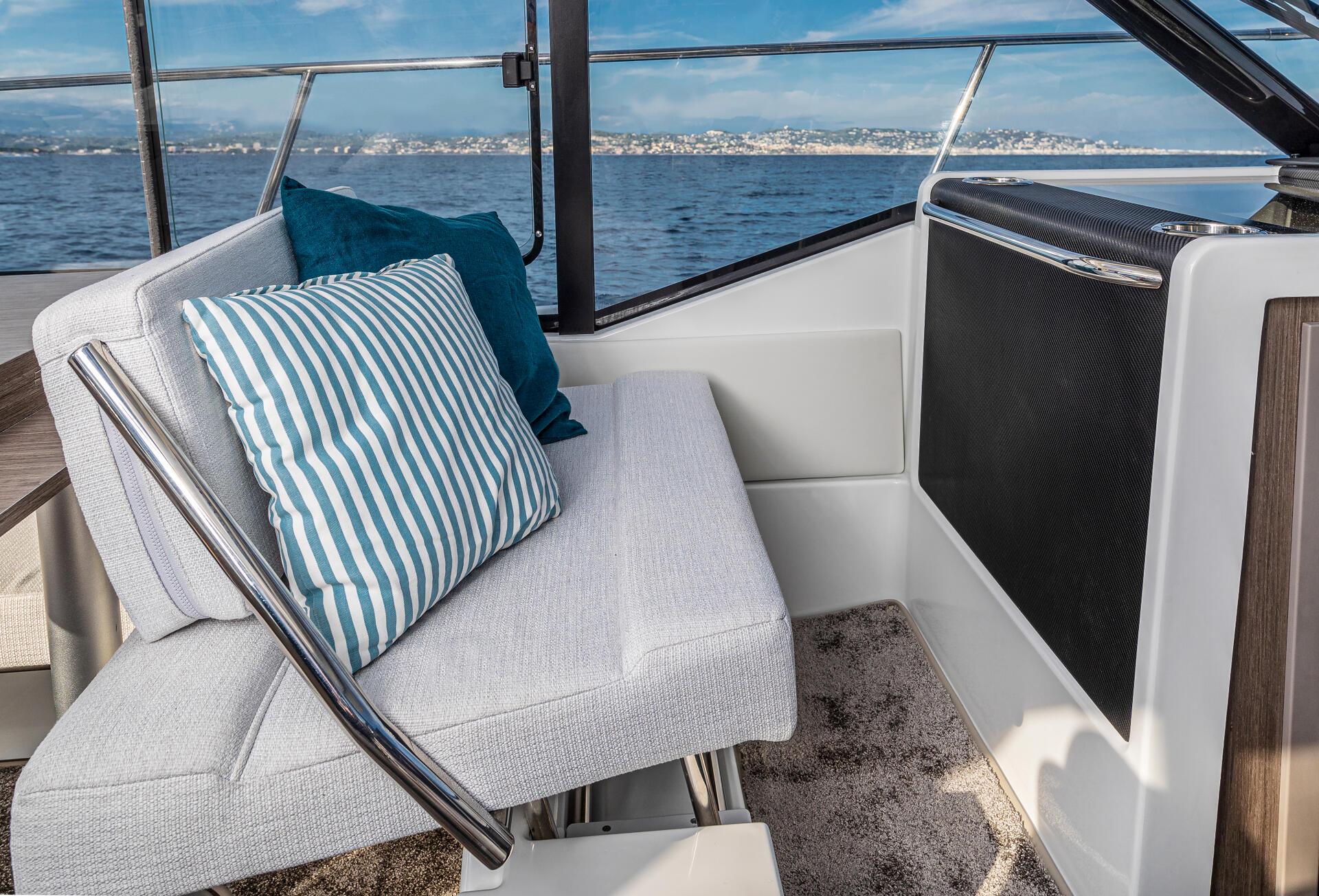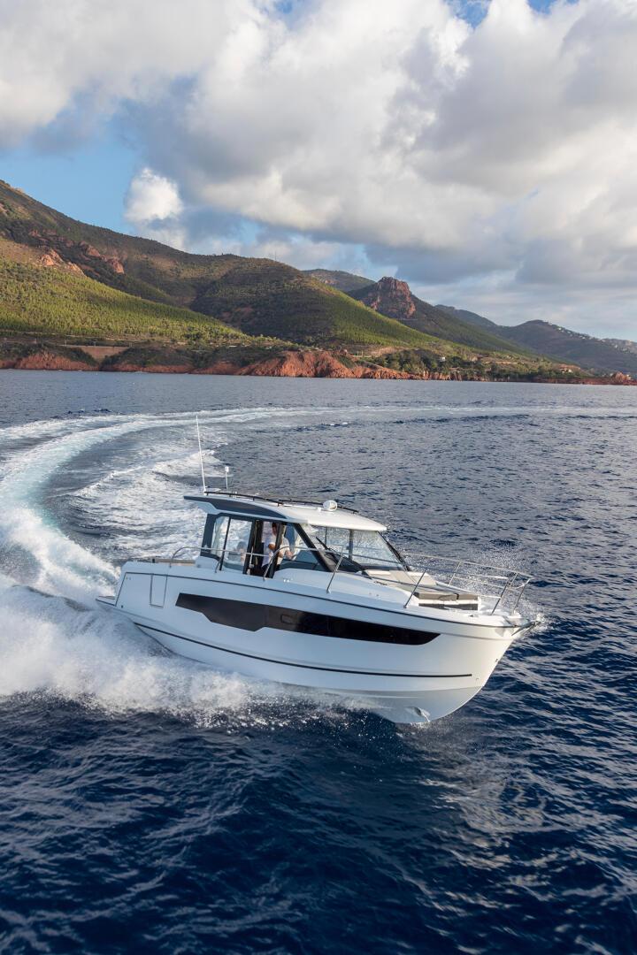 This new version integrates an elongated line, inspired by larger models of the new generation. Contemporary windows in the hull and the coachroof, with its distinctive design, integrate seamlessly into a powerful, sporty silhouette. The new hull enables planing from 20 knots, a speed easily obtained with its twin engines, 2 x 250 HP at maximum speed, ensuring comfort and manoeuvrability.