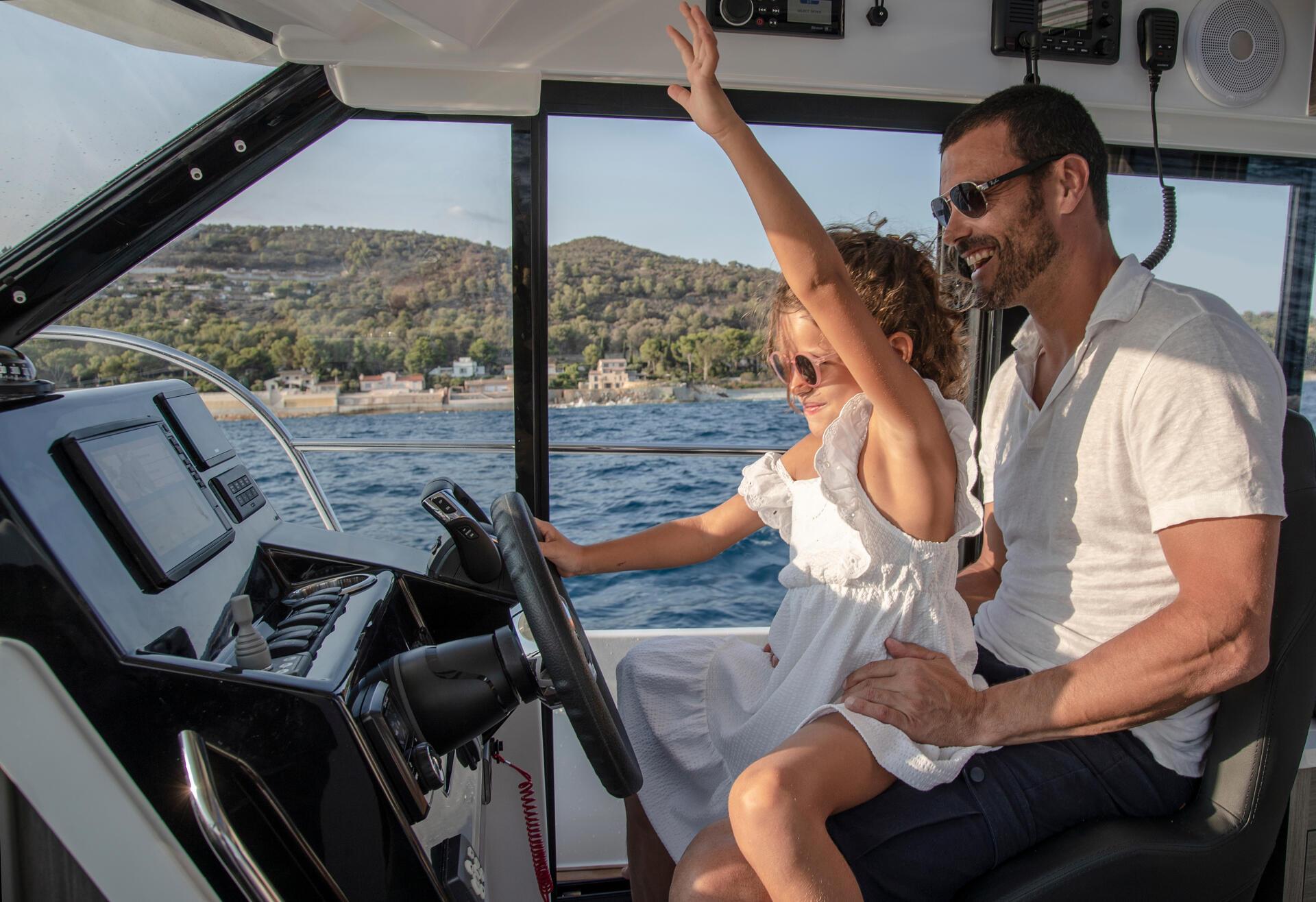 Interior living space offers a true cocoon when the mercury plunges, with a 360-degree view of the sea. Copious storage space and a new, contemporary and practical galley contribute to a harmonious life on board. When the sun is shining, the sliding glass door slides away to create a living space that opens onto the sea. With the Merry Fisher 895 Series 2, family cruises are possible in any season and on any sea.