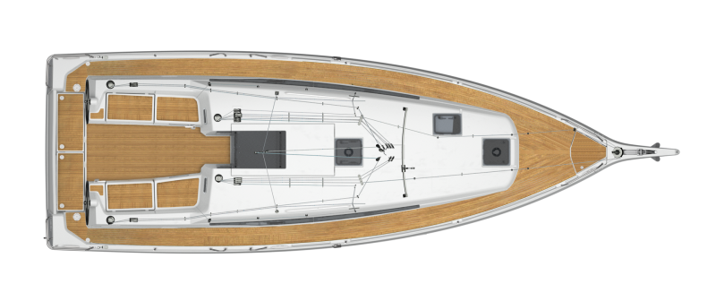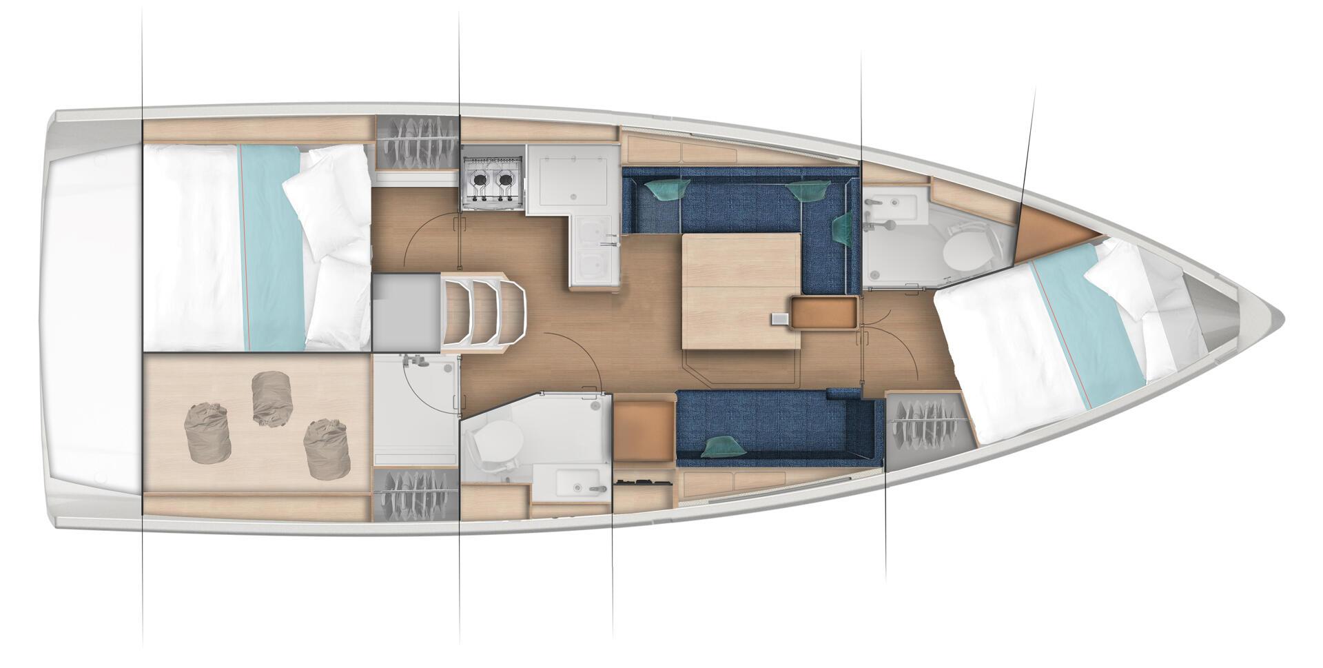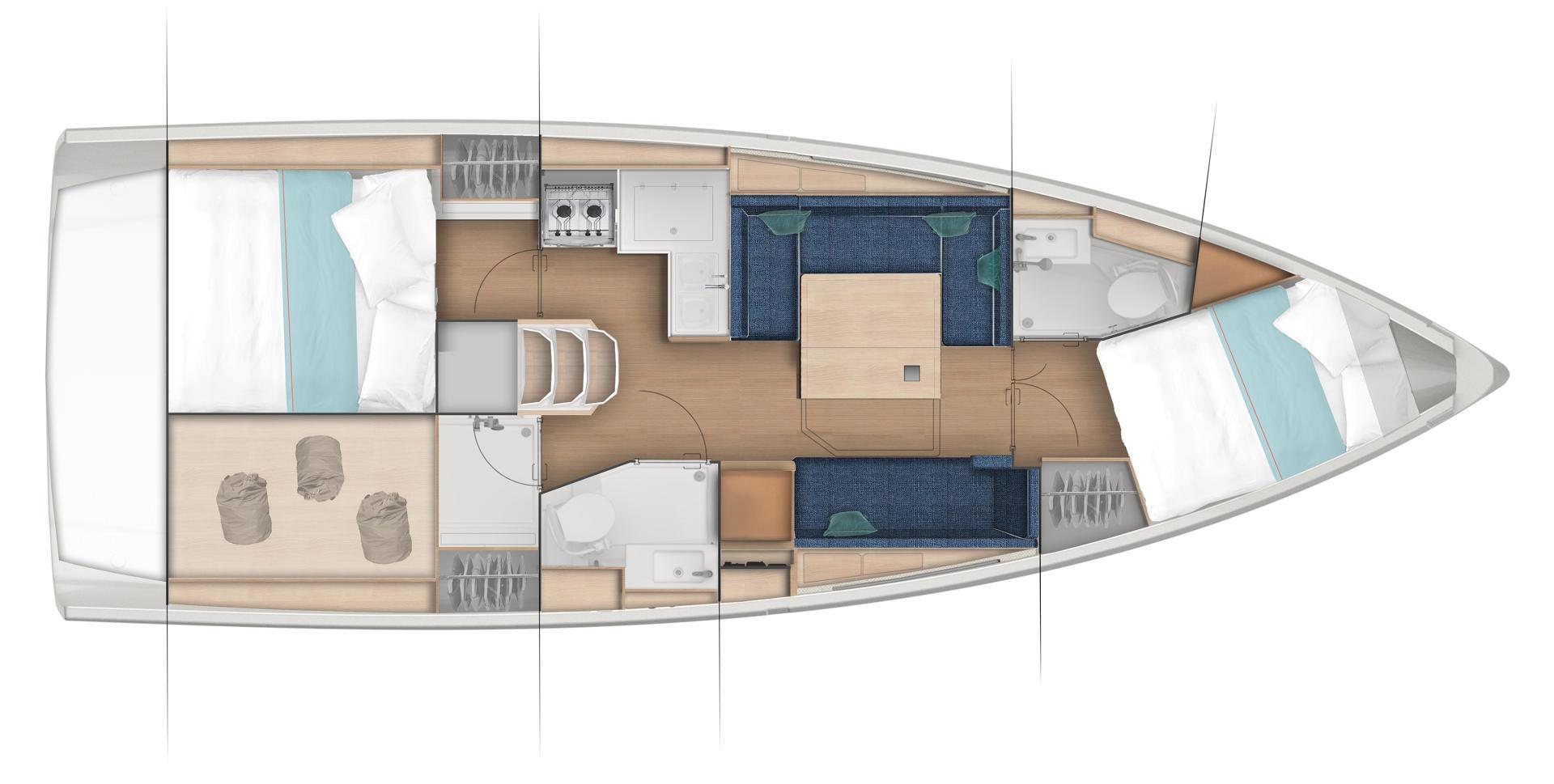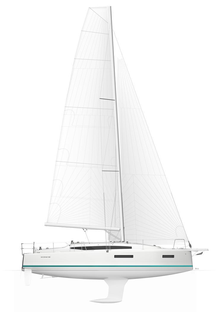 Wherever you look aboard the Sun Odyssey 380, down to the smallest detail, you find a combination of high performance, flow of movement and comfort on board. The inverted bow increases efficiency downwind, responsiveness at the helm, and ease of handling at port. Recessed side decks and twin steering wheels provide secure movement about the deck while improving visibility at the helm. The lowered boom facilitates sail access and augments the sail area without weighing down the boat. The lifting keel enables you to dry out on the sides, using removable poles, without impacting performance.