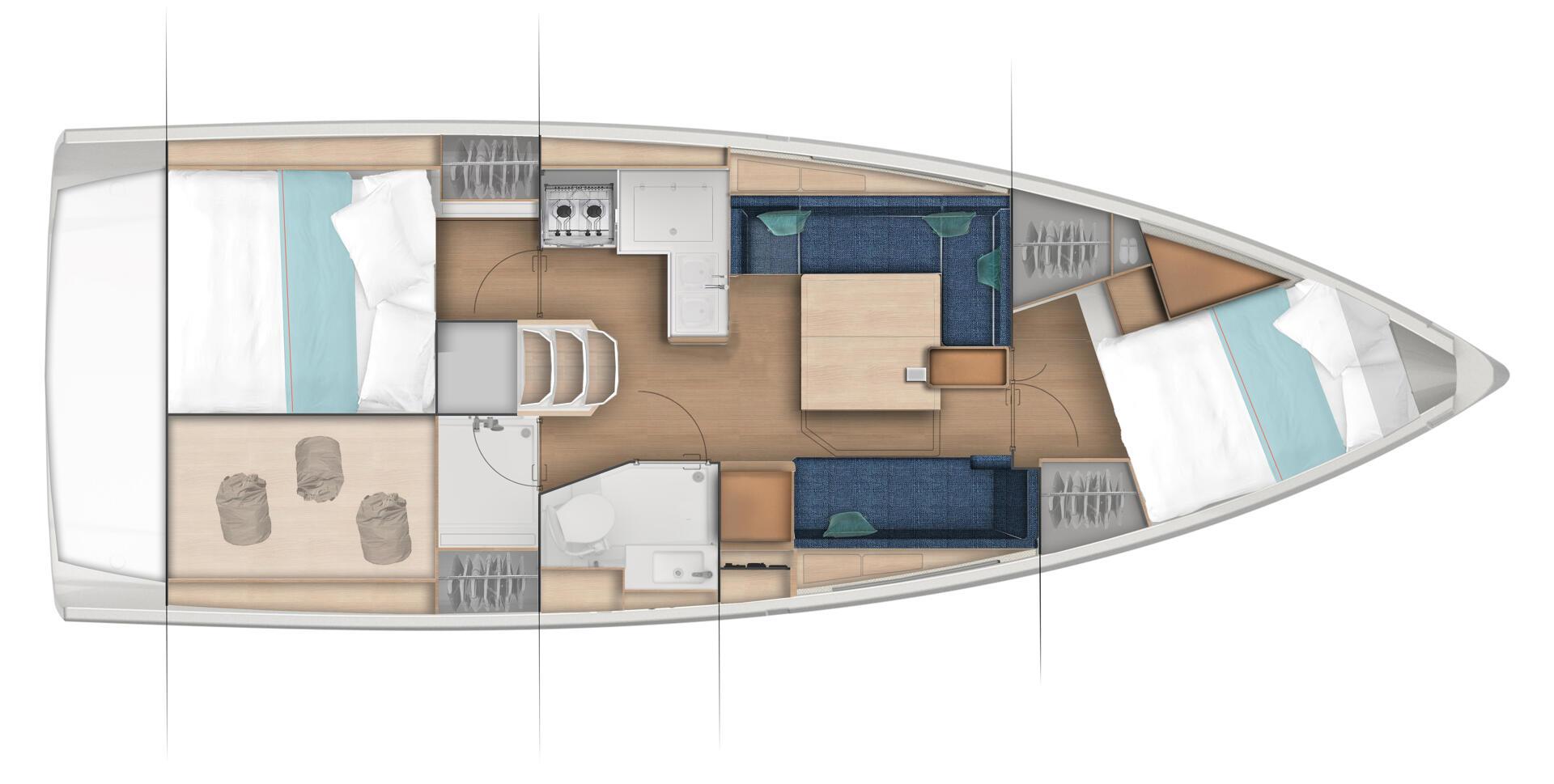 The bright, airy, interior space reveals a clean, contemporary aesthetic for a calm, comfortable atmosphere. Ingenuity and attention to detail are equally evident: a rectangular berth in the forward cabin, a daybed on the keel box for greater comfort while sailing on more agitated waters, and the possibility of having three spacious cabins or two, with two separate showers and a storage locker. With the Sun Odyssey 380, fluidity and serenity characterise life on board as much as cruising.