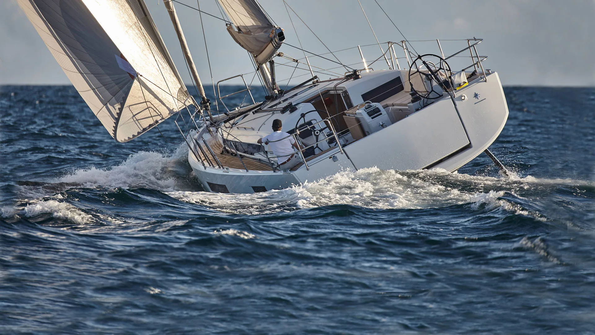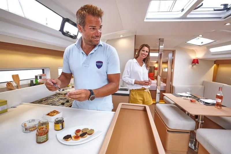The Sun Odyssey 440 offers multiple interior layouts: from the version with two immense cabins and a storage locker, to the version with four cabins, able to accommodate up to 10 people, with two in the saloon. For those adept at gentle, perfect manoeuvres, a bow thruster is available. An optional high-performance mast is available to satisfy lovers of speed and performance. And for long-distance sailors, it is possible to integrate a water-maker, solar panels, and additional batteries. Numerous options enable you to configure your boat in function with your needs and preferences.