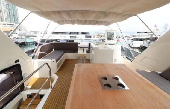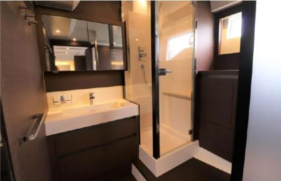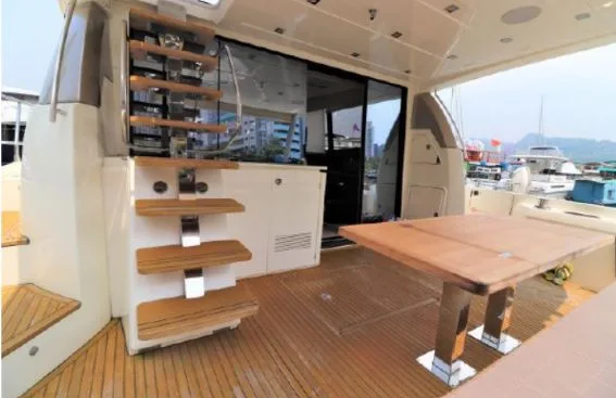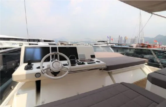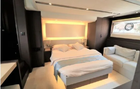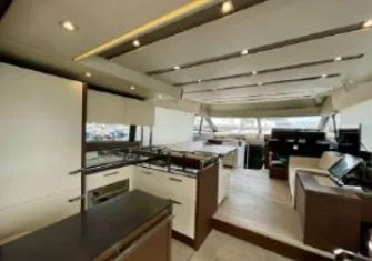 Generous living spaces include the immense saloon, three cabins with private head and shower compartments, including a centre-line owner’s cabin, and the flybridge, for absolute comfort on board.