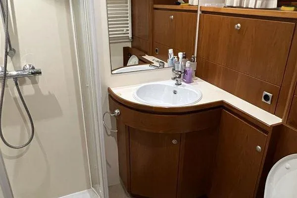 For practicality, the Delfino features a watermaker, automatic generator, and abundant storage including a huge lazaret. Outdoor living is enhanced with a BBQ, deck sink, and a dinghy for exploration.