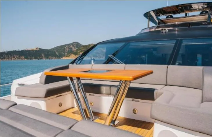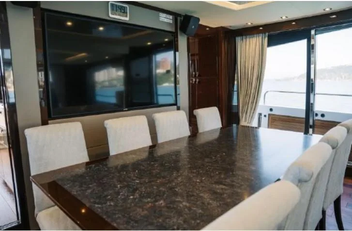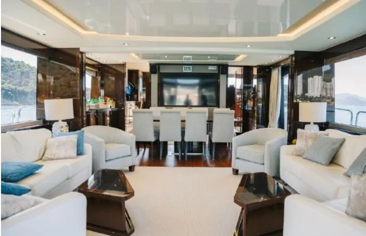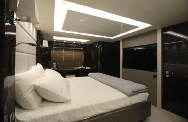 Includes twin 12V 2000 M94 MTU engines with only 720 hours reaching 30kn max speed and comfortable cruising at 24kn, tropical A/C, stabilizer, bow and stern thruster upgrade, etc. 4 Cabins layout to accommodate 8 guests, and separate staircase for master and VIP guest room. privacy door from galley and saloon.